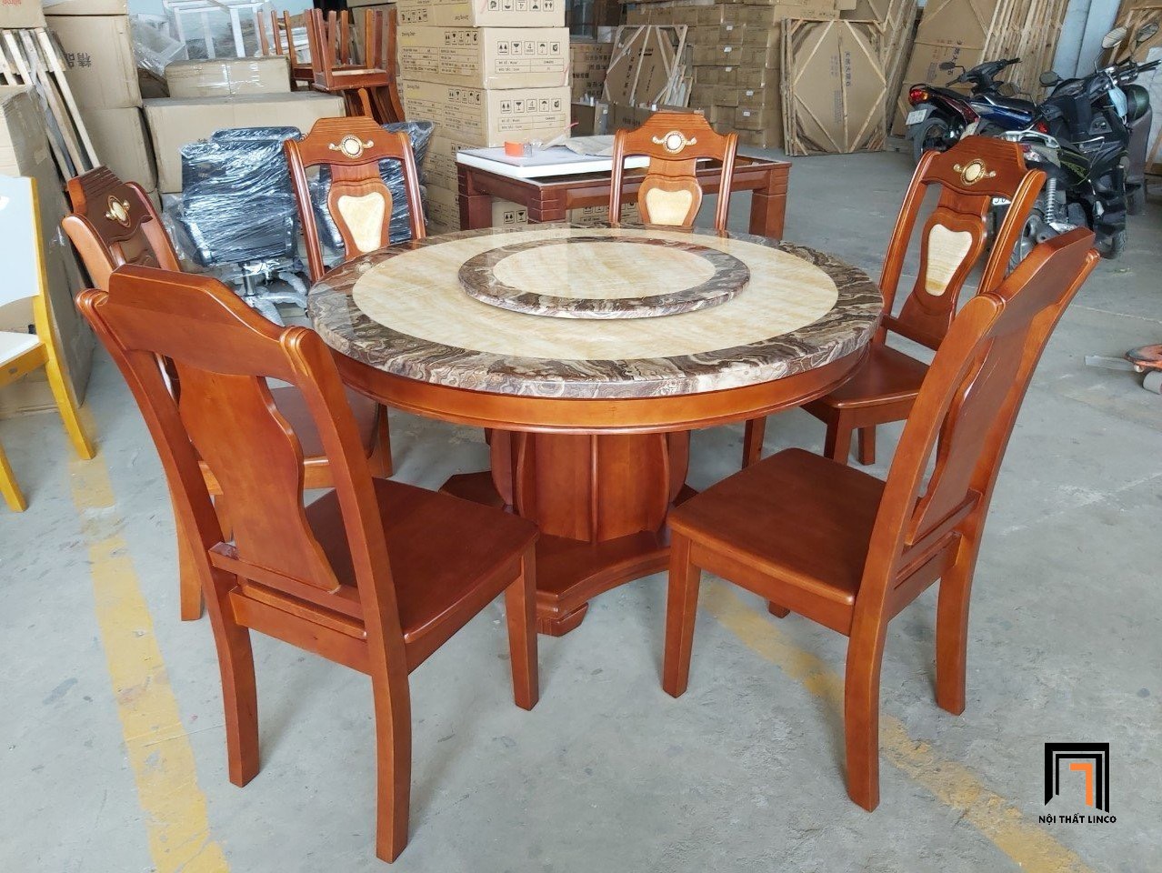 Kích thước: đường kính 1m3, 6 ghế ngồi