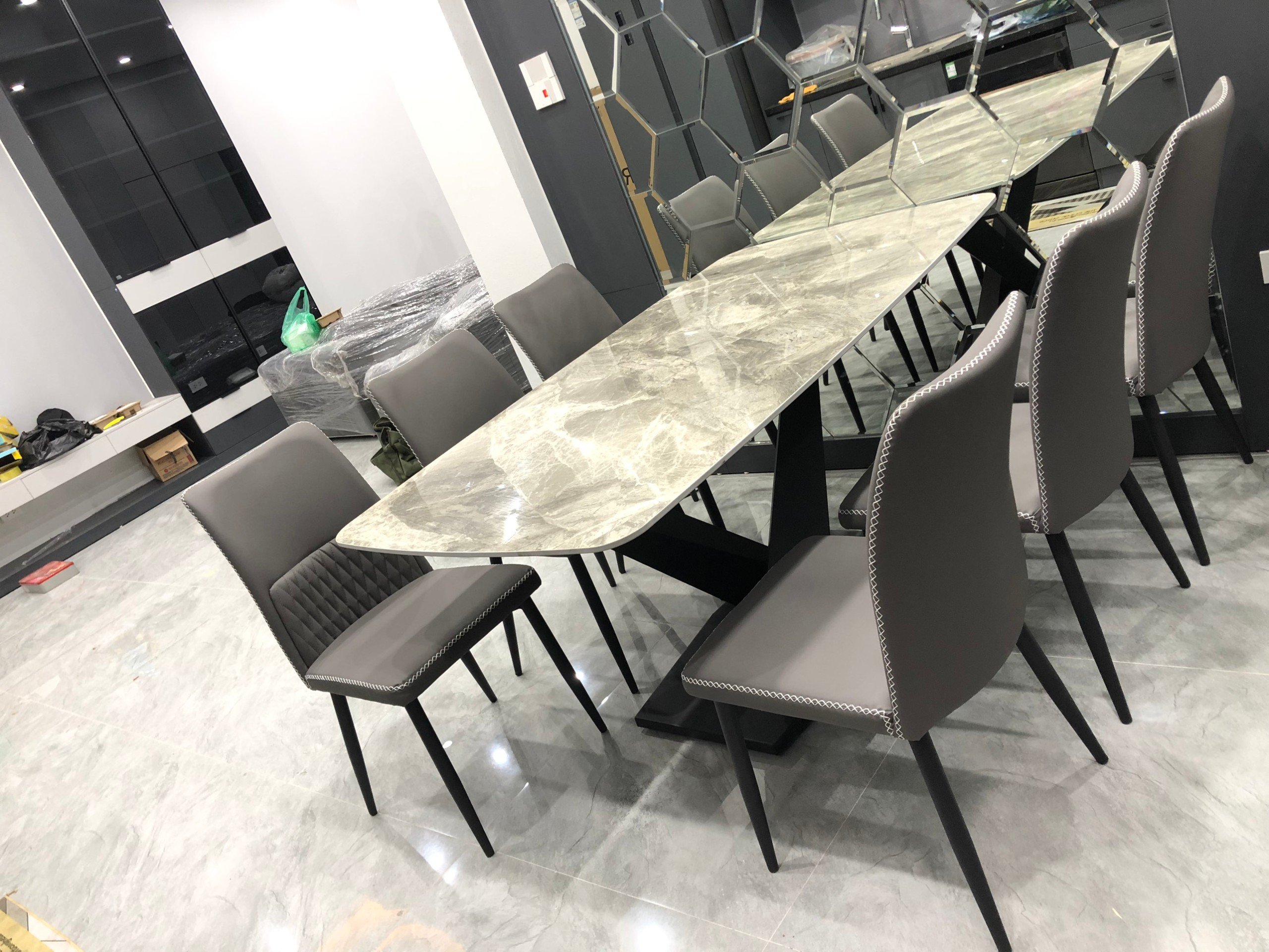 Chất liệu: bàn mặt đá ceramic, khung sắt sơn tĩnh điện. Nệm ngồi bọc da Pu