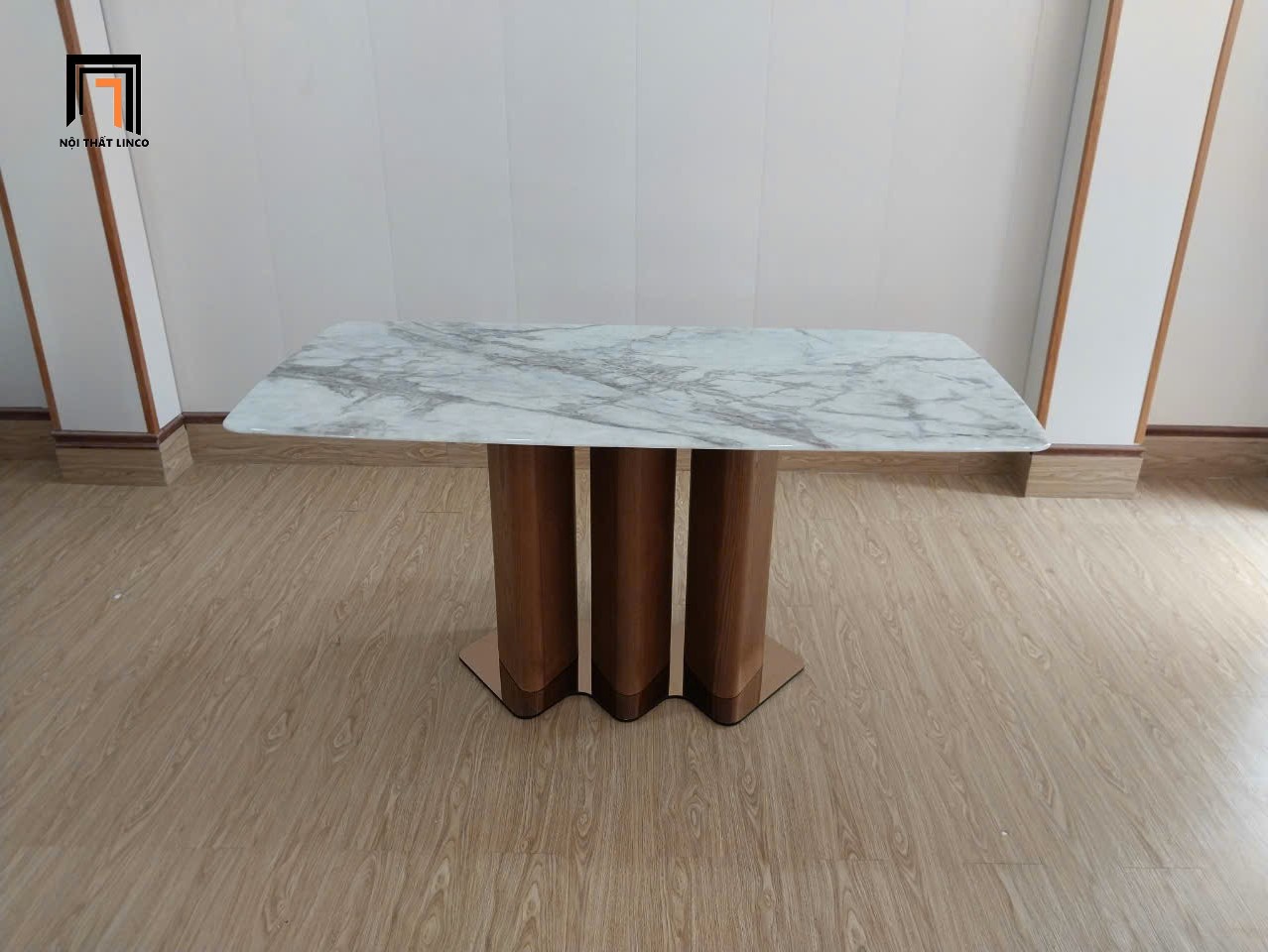 Chất liệu: bàn mặt đá vi tinh, chân gỗ. Ghế bọc da PVC