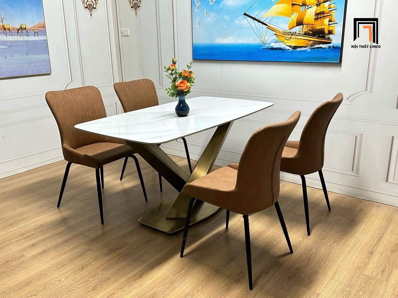 Chất liệu: bàn mặt đá ceramic, khung chân inox mạ titan. Ghế ngồi bọc da Pu, khung thép không gỉ mạ PVD