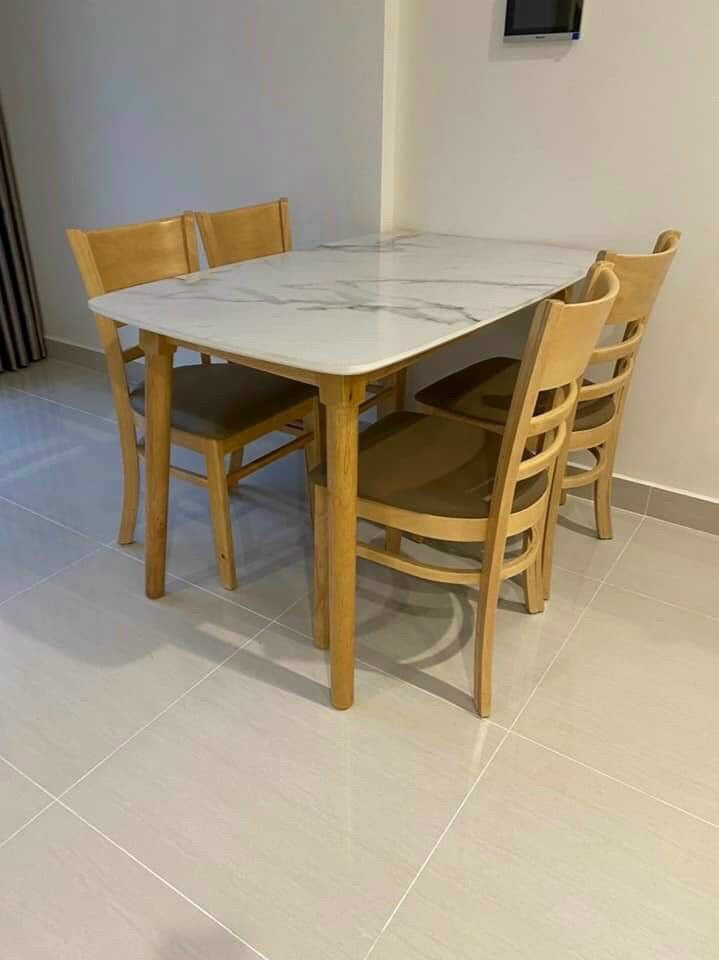 Chất liệu: gỗ cao su tự nhiên, nệm ngồi bọc da Pu, mặt bàn gỗ sơn giả đá