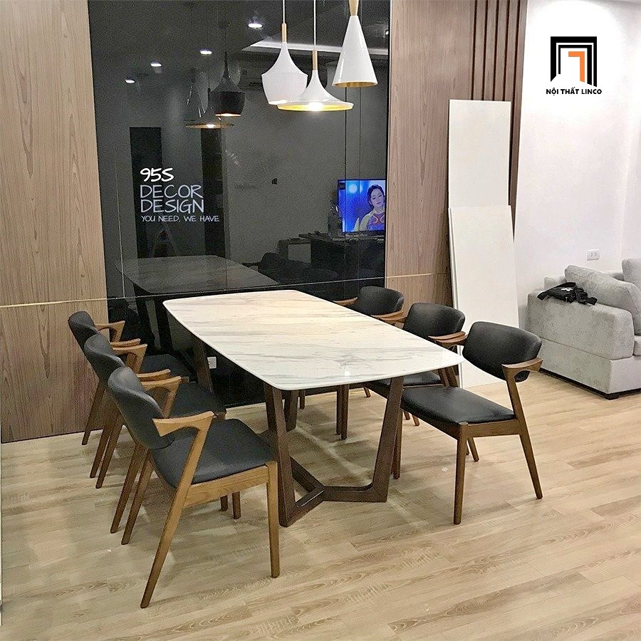 Chất liệu: gỗ cao su tự nhiên, nệm ngồi bọc da Pu, mặt bàn gỗ sơn giả đá