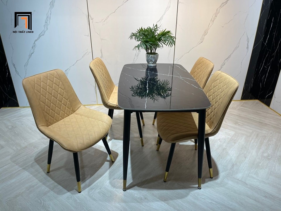 Chất liệu: bàn mặt đá ceramic, khung sắt sơn tĩnh điện. Nệm ngồi bọc da Pu
