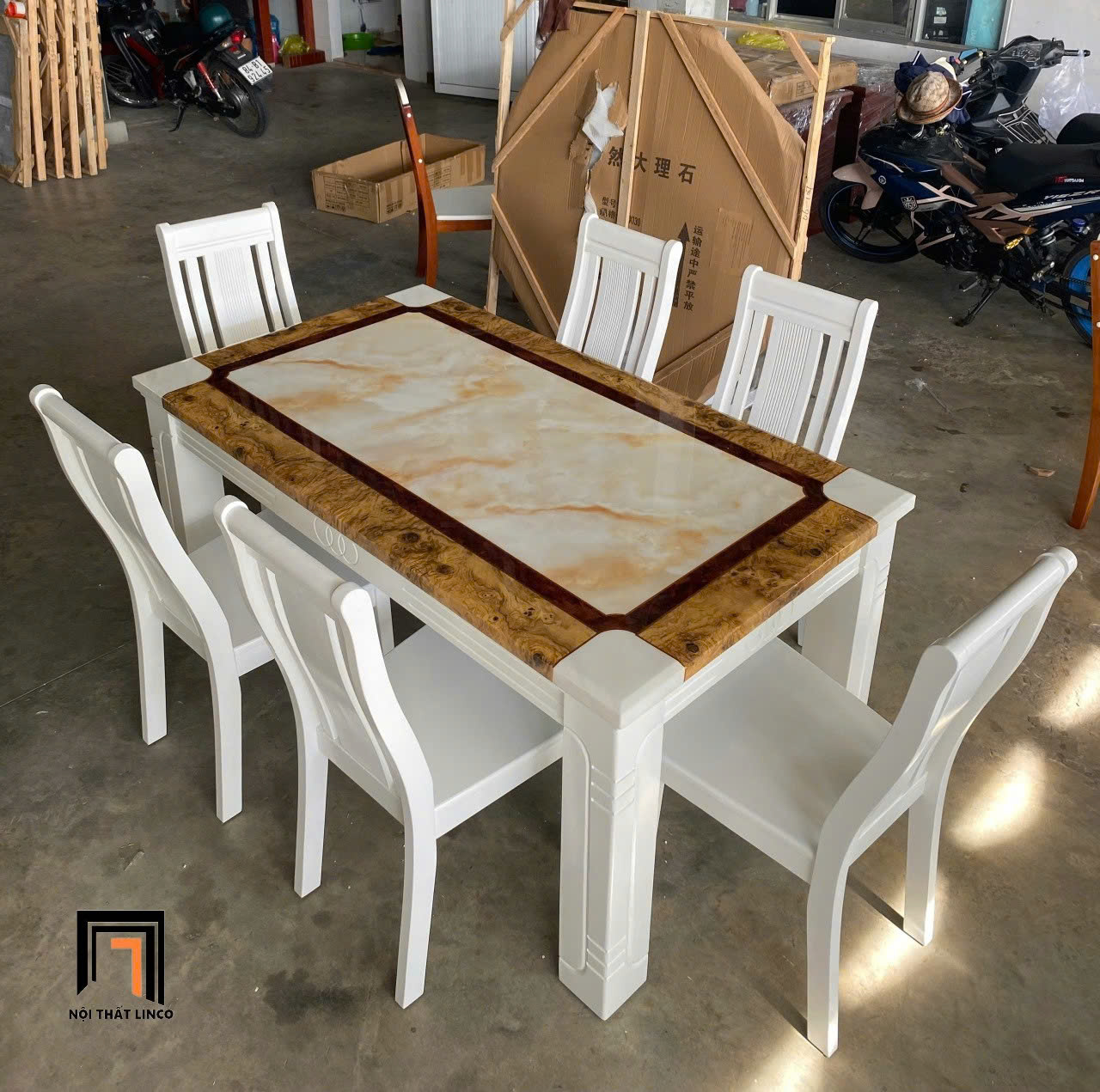 Chất liệu: bàn mặt đá dày, chân gỗ cao su. Ghế gỗ cao su