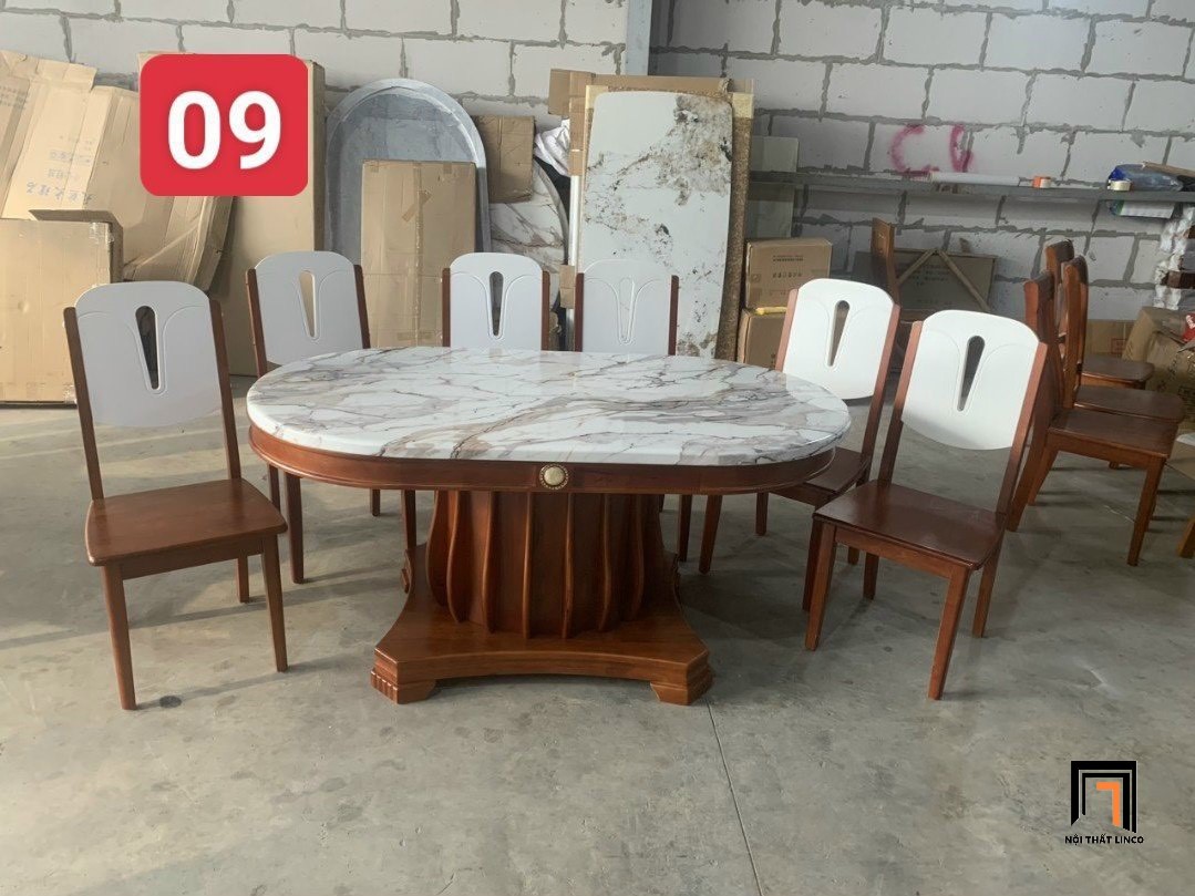 Chất liệu: bàn mặt đá dày, chân gỗ cao su. Ghế gỗ cao su