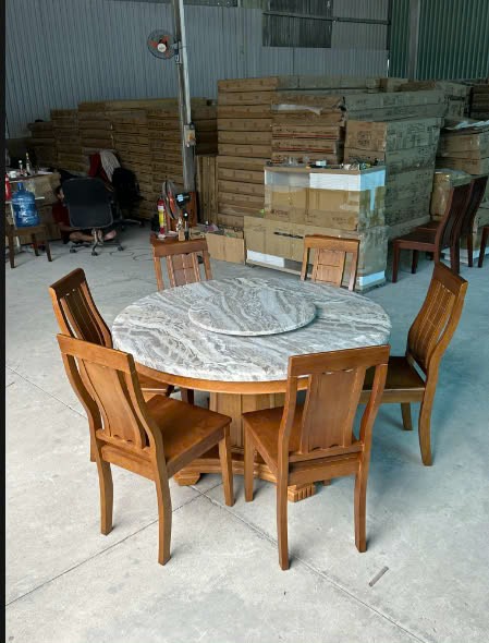 Chất liệu: bàn mặt đá, chân gỗ cao su. Ghế gỗ cao su