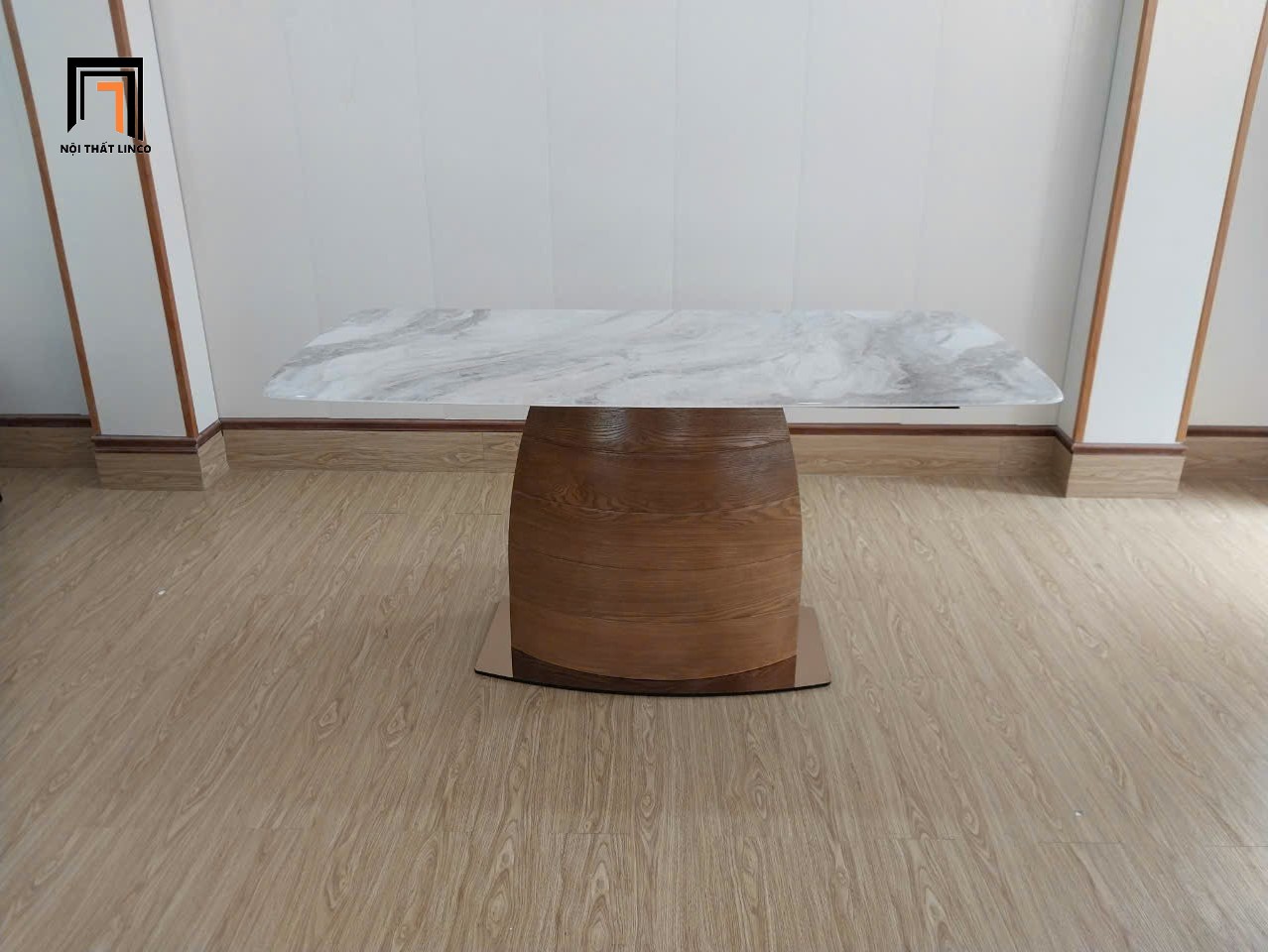 Chất liệu: bàn mặt đá vi tinh, chân gỗ. Ghế bọc da PVC