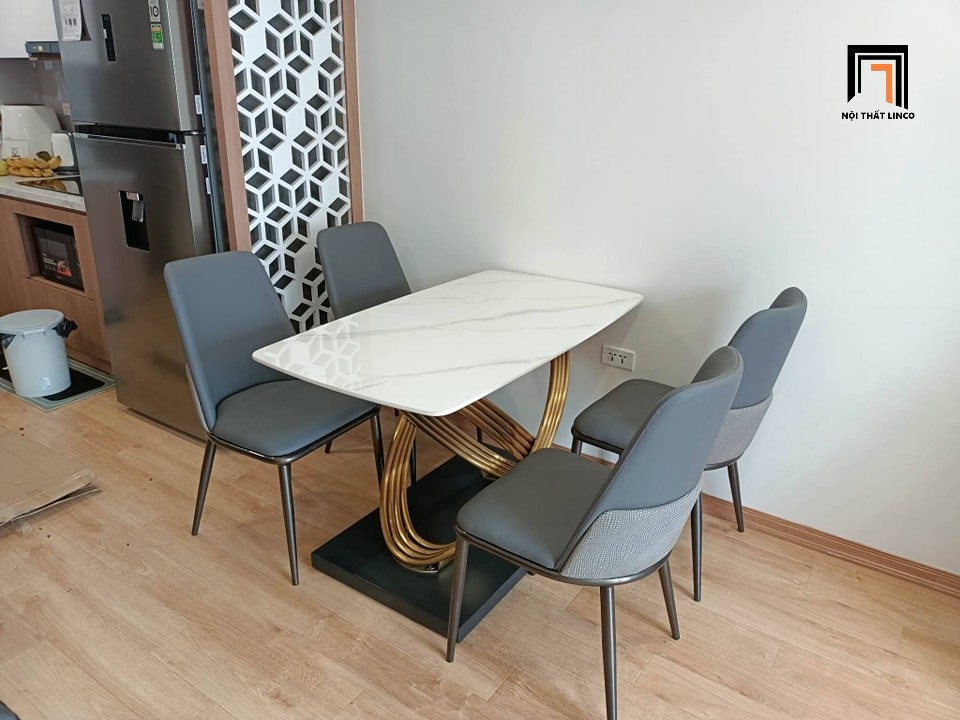 Chất liệu: bàn mặt đá ceramic, khung sắt sơn tĩnh điện. Nệm ngồi bọc da Pu