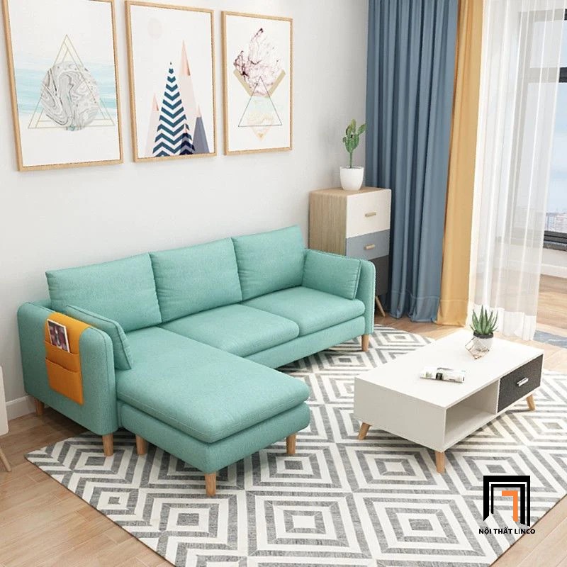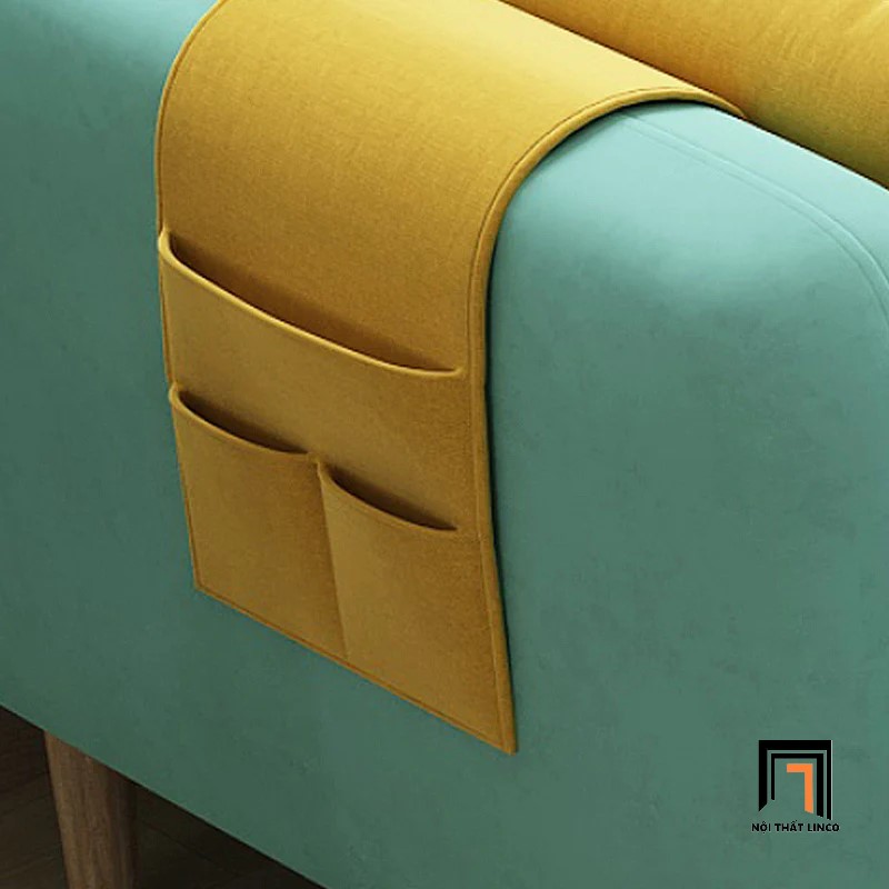 Chất liệu: khung gỗ bạch đàn, nệm mút foam nguyên tấm (nệm mềm ngồi êm, chống xẹp lún), vải bố nỉ (ngoài ra còn có vải nhung / da công nghiệp), chân gỗ cao su, tay có túi đựng báo remote.