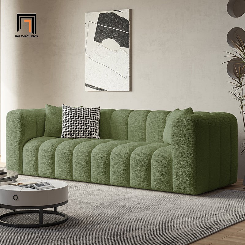 - Chất liệu: khung gỗ bạch đàn, nệm mút foam nguyên tấm (nệm mềm ngồi êm, chống xẹp lún), vải lông cừu (ngoài ra còn có vải nhung nỉ / vải bố / da công nghiệp), chân gỗ cao su