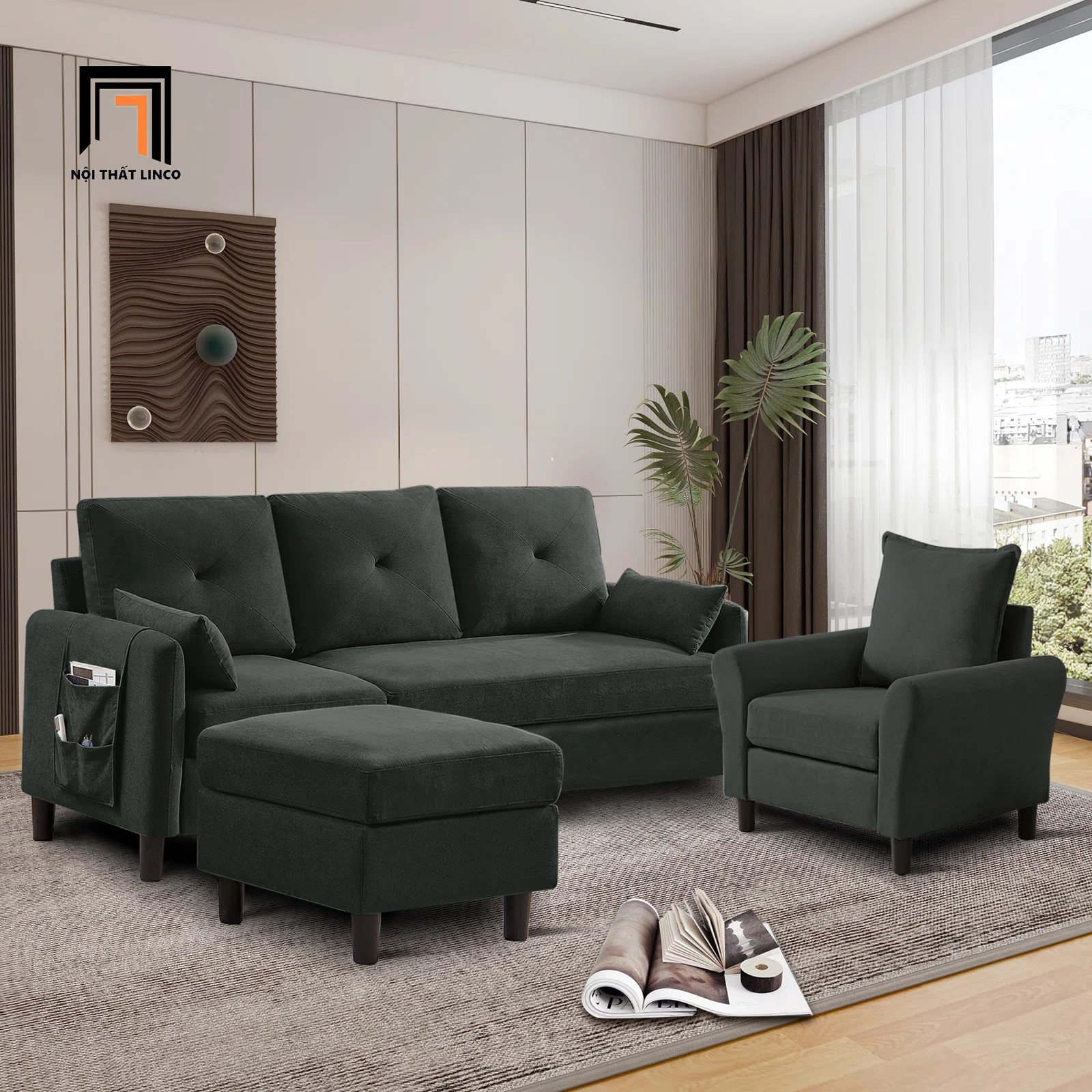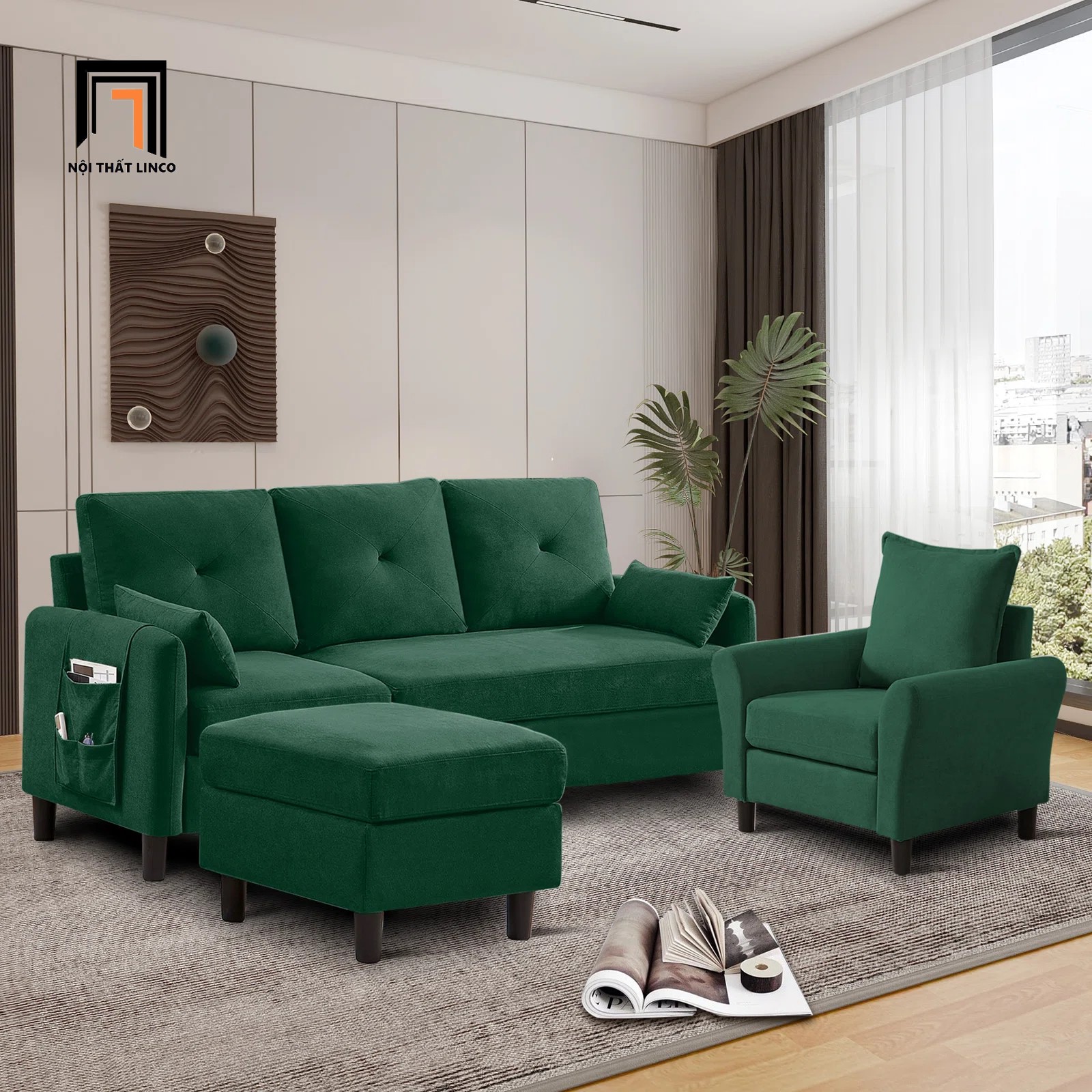 - Chất liệu: khung gỗ bạch đàn, nệm mút foam nguyên tấm (nệm mềm ngồi êm, chống xẹp lún), vải nỉ (ngoài ra còn có vải nhung bố / da công nghiệp), chân gỗ cao su.