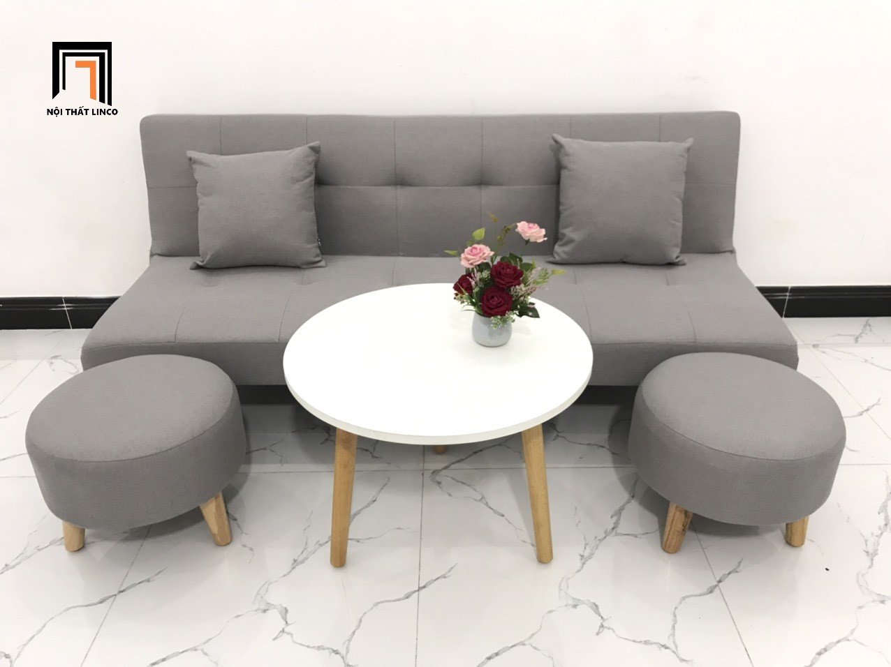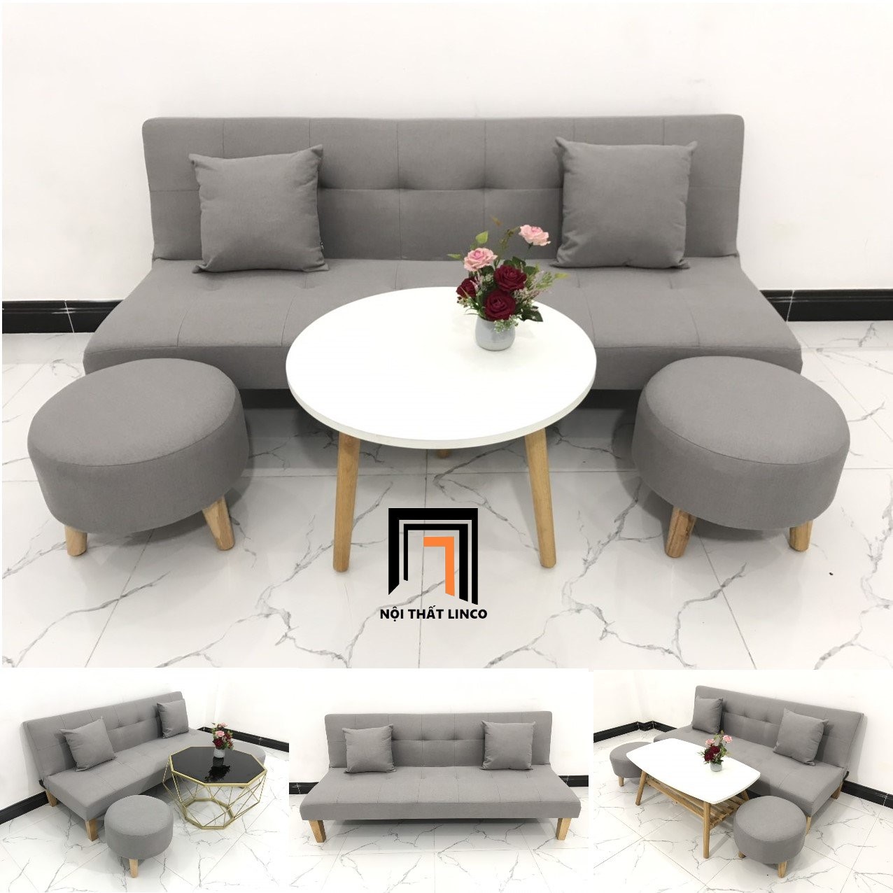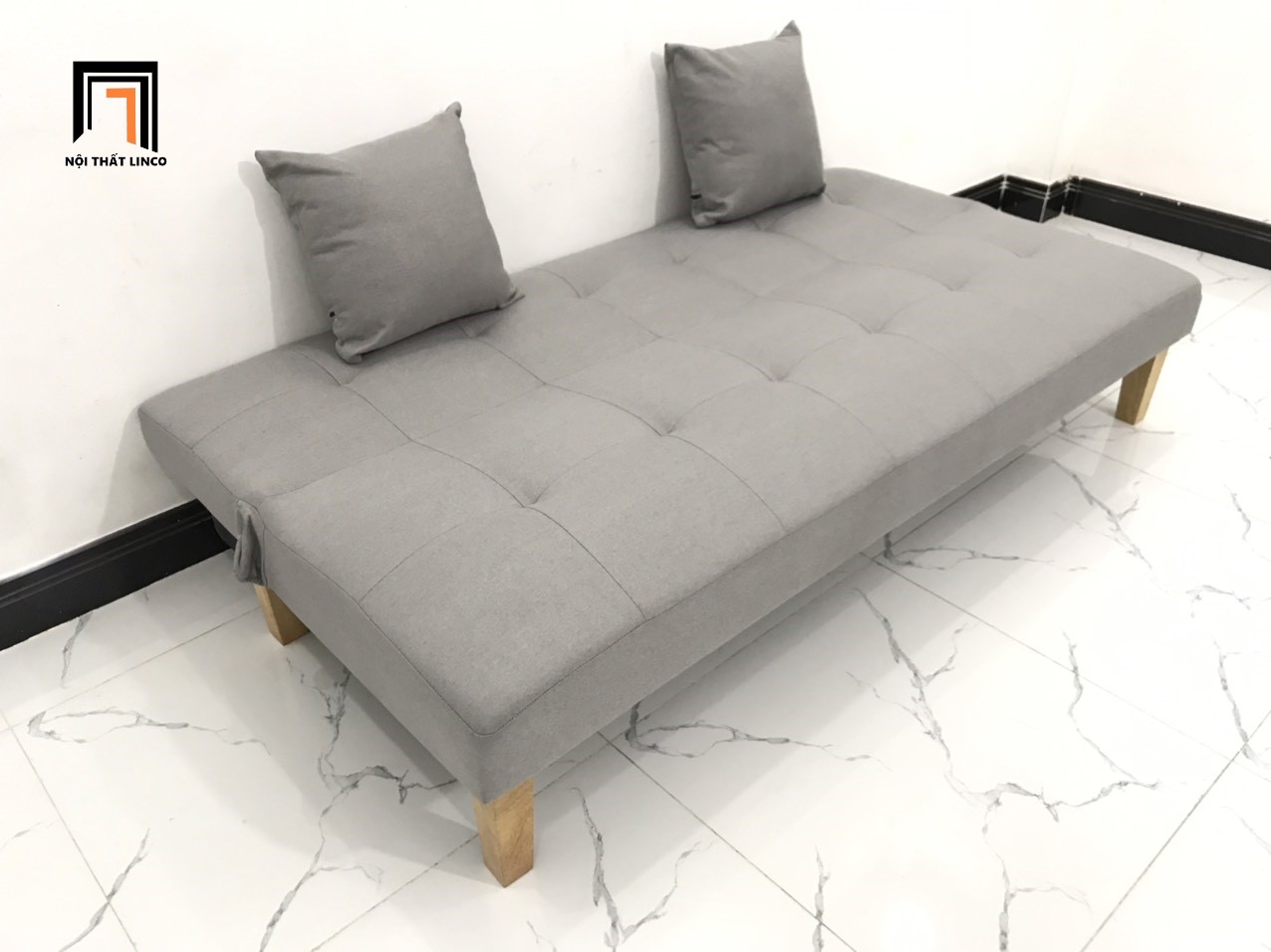 Chất liệu: khung gỗ bạch đàn, nệm lò xo đàn hồi tốt, mút foam nguyên tấm, vải bố / vải nhung / simili giả da.