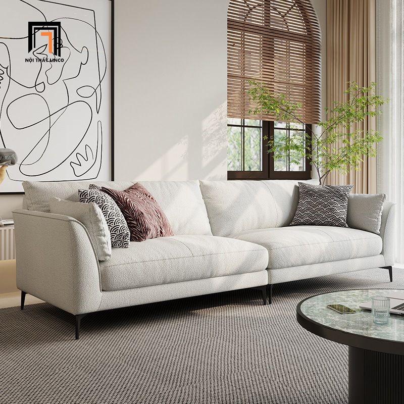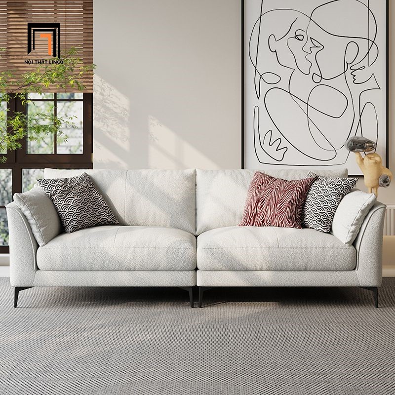 - Chất liệu: khung gỗ bạch đàn, nệm mút foam nguyên tấm (nệm mềm ngồi êm, chống xẹp lún), vải nhung nỉ (ngoài ra còn có vải bố / da công nghiệp), chân inox sơn tĩnh điện.