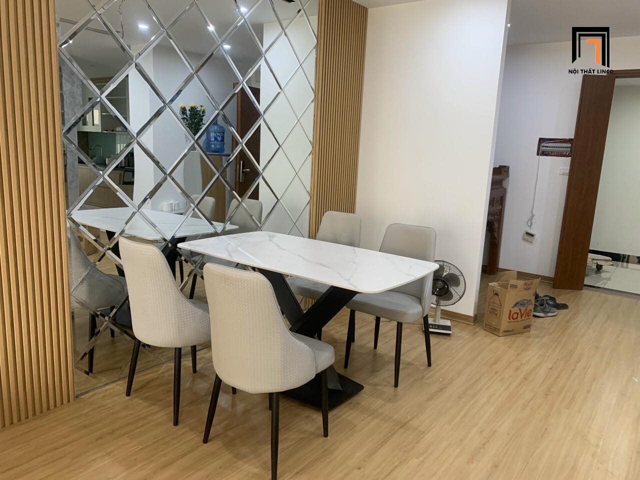 Chất liệu: bàn mặt đá ceramic, khung sắt sơn tĩnh điện. Nệm ngồi bọc da Pu