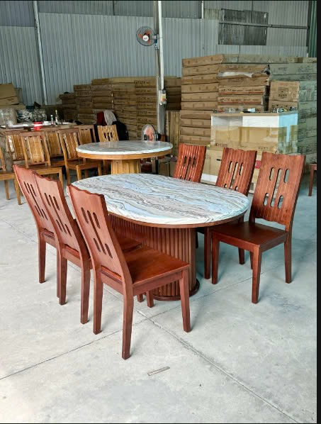 Chất liệu: bàn mặt đá dày, chân gỗ cao su. Ghế gỗ cao su