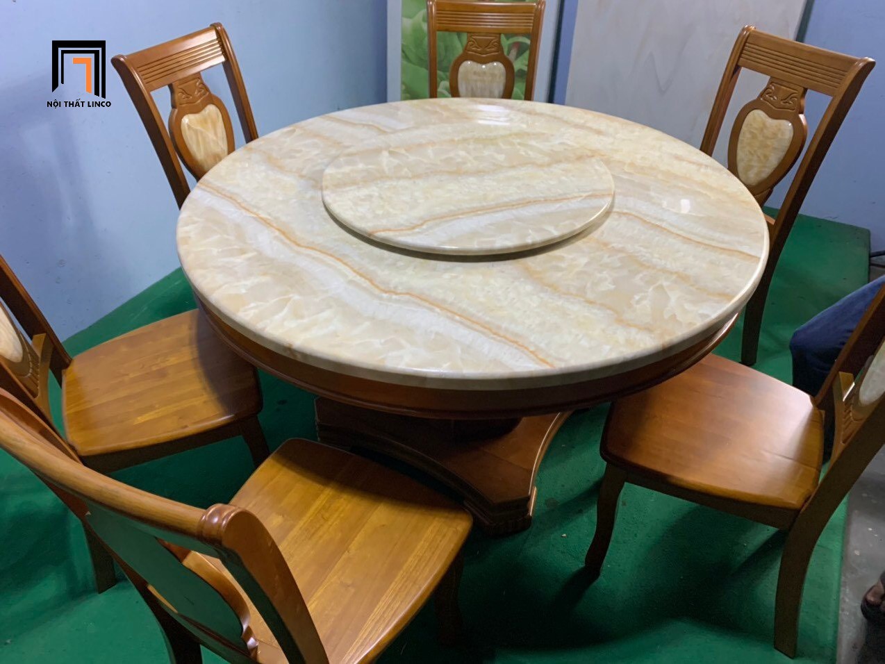 Chất liệu: bàn mặt đá, chân gỗ cao su. Ghế gỗ cao su